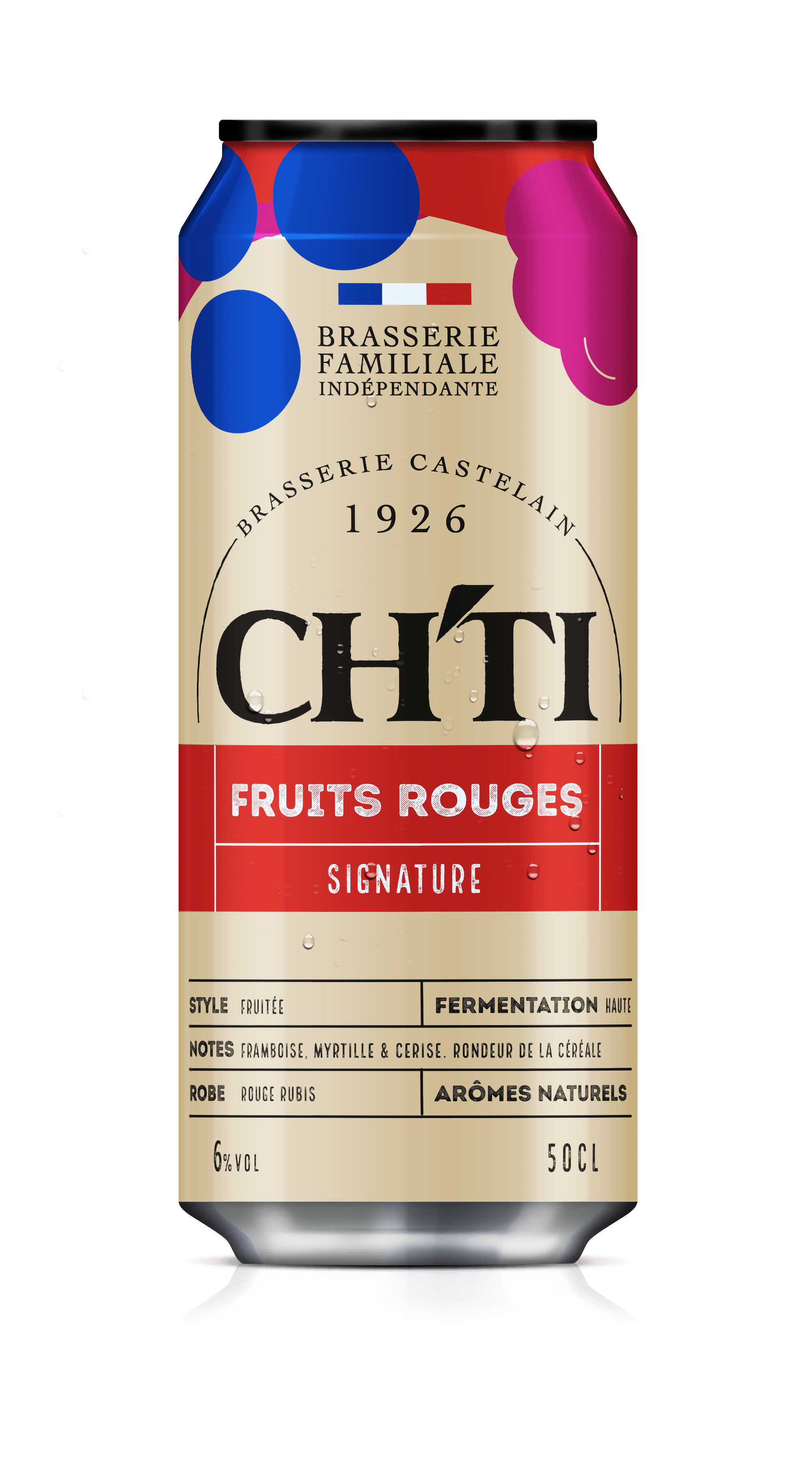 La brasserie Castelain joue sur deux tendances fortes. Elle se déploie, en effet, sur les bières de spécialités fruitées avec sa formule aux fruits rouges à sa marque Ch’ti. Cette nouveauté, titrant 6°, présente des arômes de framboise, de myrtille et de cerise, tout en conservant de belles notes maltées. Elle est disponible notamment en can de 50 cl, un format répandu dans le Nord et de plus en plus porteur sur le marché national des bières. La boîte offre, en outre, un design premium grâce à l’apposition du drapeau français et de mentions clés mettant en valeur la brasserie comme la recette.
