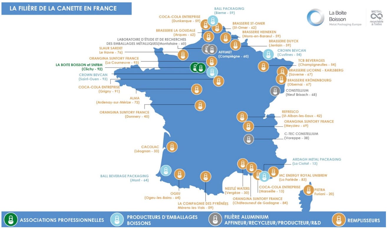 En France, la filière des canettes compte 28 usines et centres de Recherche et Développement sur tout le territoire. Elle représente 1 000 emplois directs, répartis dans toute la France et