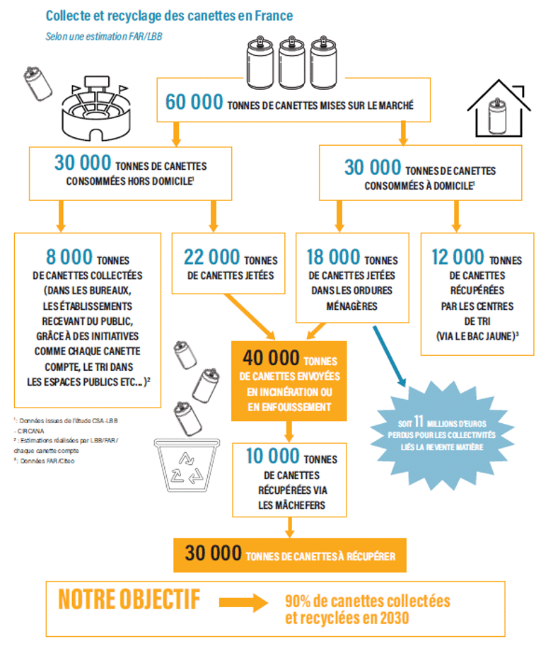Jusqu’à 30 000 tonnes de canettes seraient consommées en dehors du domicile. Ces canettes ne pourront pas être correctement triées et recyclées s’il n’existe pas de dispositif de collecte hors foyer adapté, pratique et accessible au plus grand nombre.