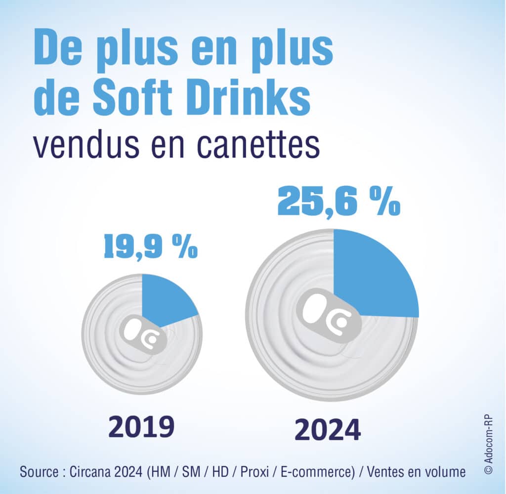 En 2024, leurs ventes ont progressé de +2,9 % en magasins, sur un marché en baisse de -2,8 % vs 2023. Désormais, plus de 1 soft-drink sur 5 (25,6 %) est vendu en canette, soit +1,6 pt vs 2023 et + 5,7 pts depuis 2019, année de référence pré-covid.