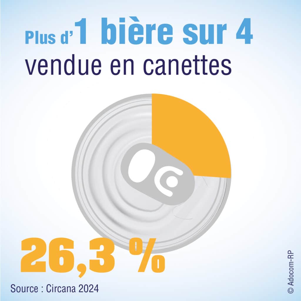 En 2024, la part des bières vendues en canettes est montée à 26,3 %, en hausse de +1,5 pt vs 2023 et +1,2 pt vs l’année de référence 2019. Leurs ventes ont augmenté de +4,2 % en volume en 2024, tandis que le marché global des bières était en recul de -1,6 %.