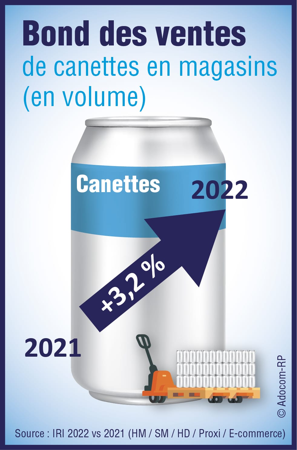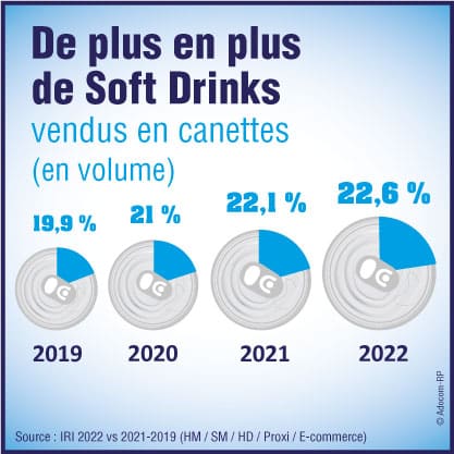 En 2022, leurs ventes ont augmenté de 5,7% en volume ! En valeur, la canette représente désormais 1/3 du chiffre d’affaires de ce segment. En 2022, la part des canettes dans les ventes de soft-drinks en magasins a gagné 0,5 point pour atteindre la part historique de 22,6%.