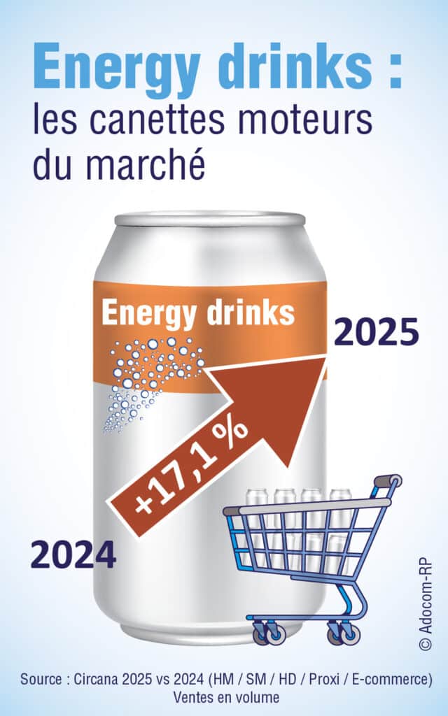 Si la canette gagne des parts de marché sur la quasi-totalité des soft-drinks (excepté dans les boissons au fruits plates et limonades), la croissance des canettes de soft-drinks est largement portée par les energy drinks. Sur ce segment, les canettes restent hégémoniques tout en conservant leur dynamisme, à +17,1 % vs +15,5 % pour le marché des Energy drinks au global.