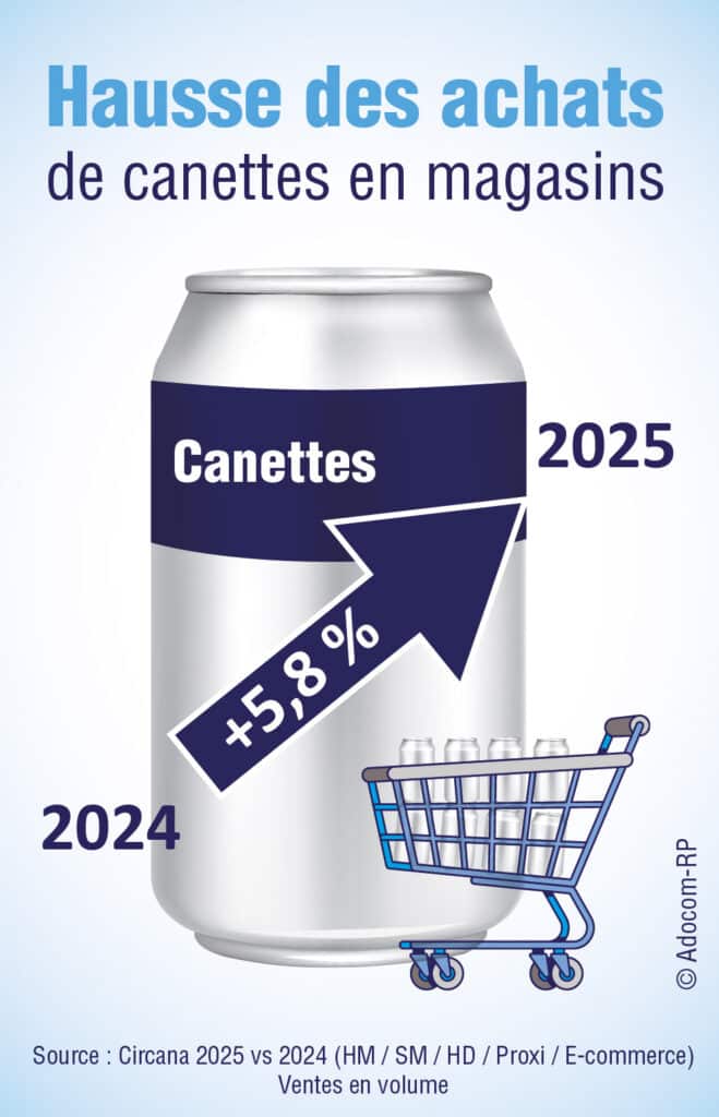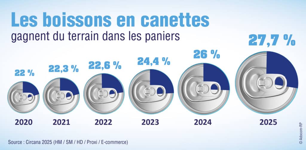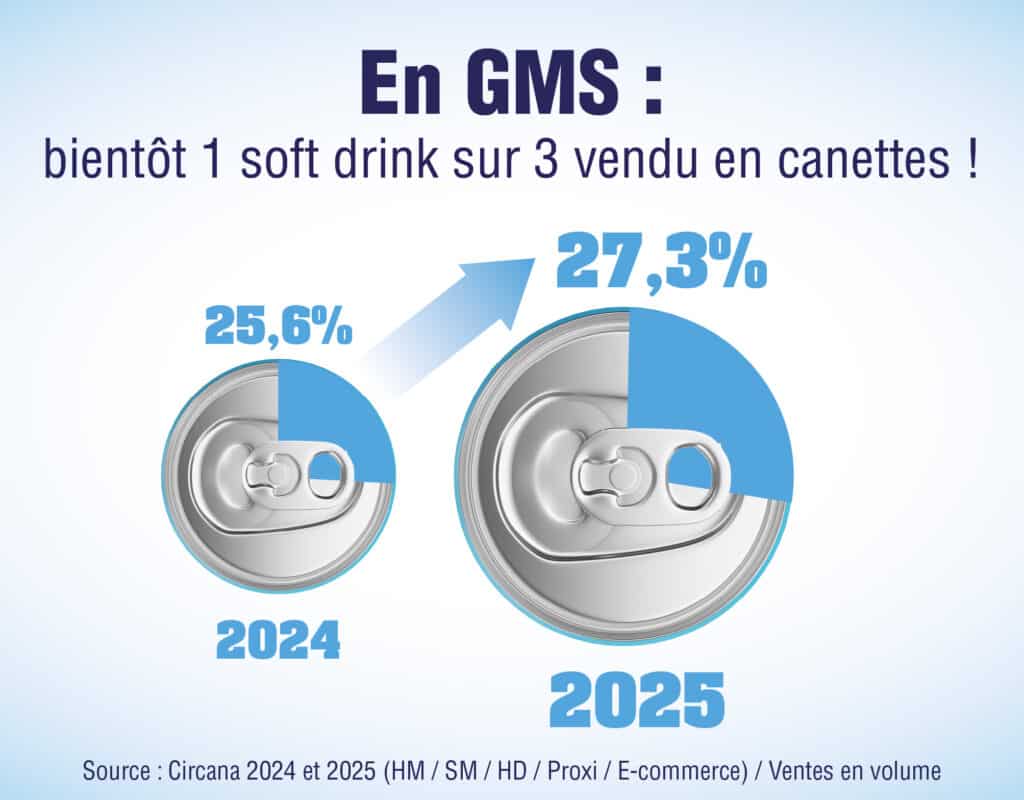 En valeur, les canettes représentent 40,7 % du marché des softs drinks, soit +2,1 pts vs 2024.