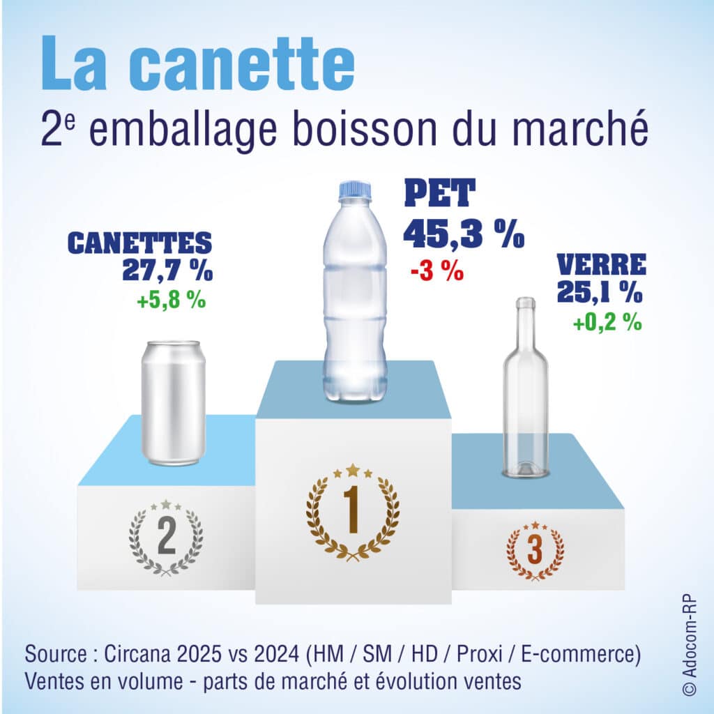 La canette, passée devant le verre l’année dernière, conforte ainsi sa place de 2e emballage boisson le plus vendu en magasins dans les segments boissons et bières. Le plastique se maintient à la 1ère place, avec 45,3 % de parts de marché en 2025 malgré le recul de ses ventes (-3 % en vol.) et le verre reste au pied du podium avec 25,1 % de parts du marché (+0,2% en vol.)